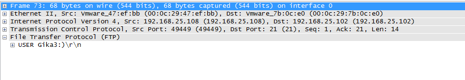 可以看到USER部分发送了一个用户名为Gika3:)数据包,接下来继续抓包。